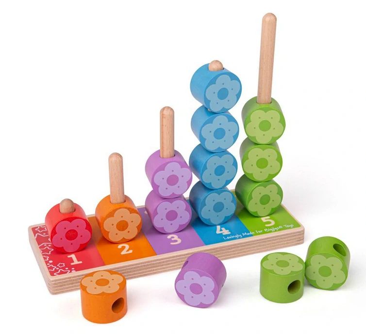 Vzdělávací dřevěné nasazování barevných květinek pomůže dítěti naučit se hravou formou rozlišovat barvy, počítat a procvičovat jemnou motoriku. Barevné květinky se nazazují na příslušné kolíky.