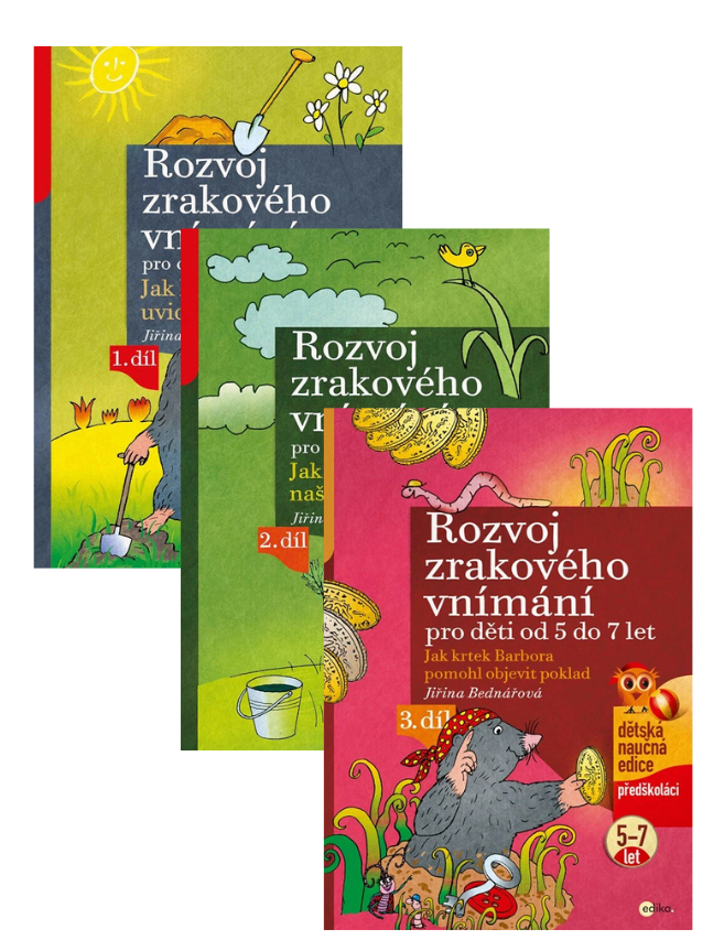 Rozvoj zrakového vnímáníTři publikace určené předškolním dětem k rozvoji zrakového vnímání a prevenci potíží ve čtení a psaní plynoucích z nedostatečné zrakového vnímání. Kniha se věnuje rozlišení a pojmenování barev, odlišení tvarů prvků. V knize jsou zahrnuta cvičení z oblasti zrakové diferenciace, zrakové analýzy a syntézy, zrakové paměti, rozlišení figury a pozadí, rovněž také cvičení k rozvoji očních pohybů. Pro děti od 3 let. |