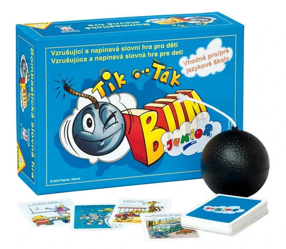 Rychlá slovní hra Tik Tak Bum Junior podporuje kreativitu, spontánnost a slovní zásobu. Zapni bombu, odkryj kartu, řekni slovo, které souvisí s obrázkem na kartě a předej rychle tikající bombu dalšímu hráči.