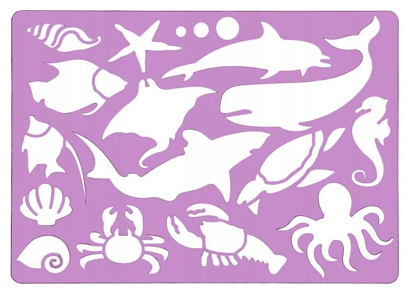 Plastová šablona na kreslení – OCEÁN (motiv “mořští živočichové“). Šablona se používá na překreslení motivu na papír.